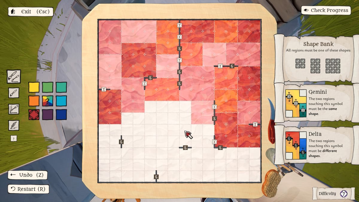 The view being: getting to a desired objective, shouldn't strictly be limited to one "sequence". Perhaps it should be left to players to determine, of the two dozen-or-so puzzles provided for that given area, which of these they feel confident in tackling. Should you wish to stick to the "main path" of difficulty "1" and "2"-graded puzzles, that's totally fine. But if you already feel accustomed to the new rules and wish for something a bit more complex or grander in size – a self-made and self-propelling challenge on top – completing difficulty 4/5/6-grade puzzles, is an option the game abundantly provides room for.