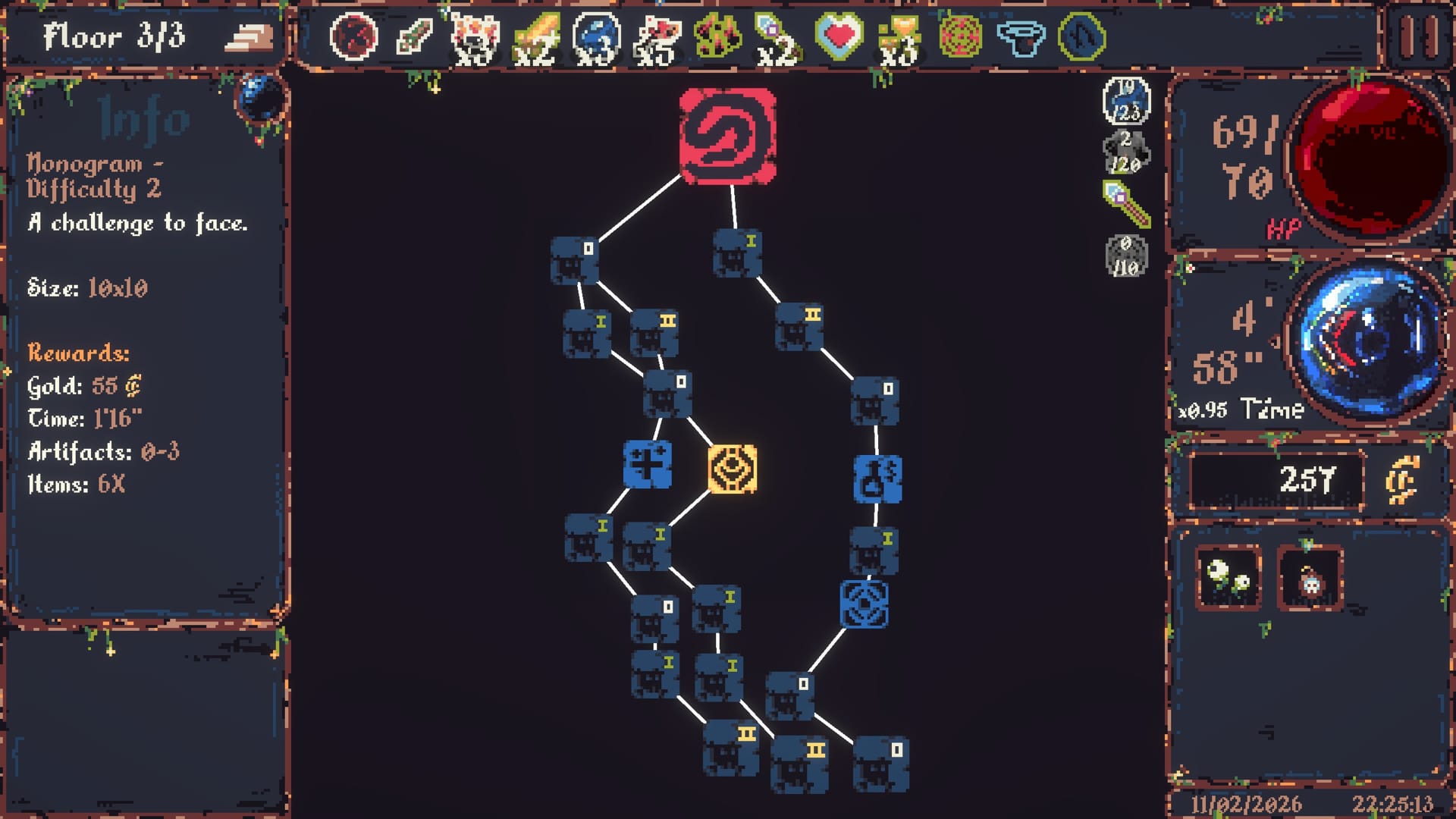 "In-game" being quite the operative terminology here, not least when the rate of passage increases beyond the standard x1.00 speed. A metric that can not only increase, but something one can (when the opportunity arises) decrease through item usage and employed passive skills. It isn't long before you find yourself worryingly making passing glances at that very clock. Ticking down as it does – at worst, at its currently abnormal pace – and the dilemma on how much virtue patience truly plays, becomes critical. How expendable is one's health, truly? Is it a risk worth taking? On the question of branching paths: is it worth bearing the brunt of a level 4 board – the sprawl of a 20x20 grid staring you in the face – knowing there's a shop tile straight after? Or better to play it safe with three level 0 equivalents?