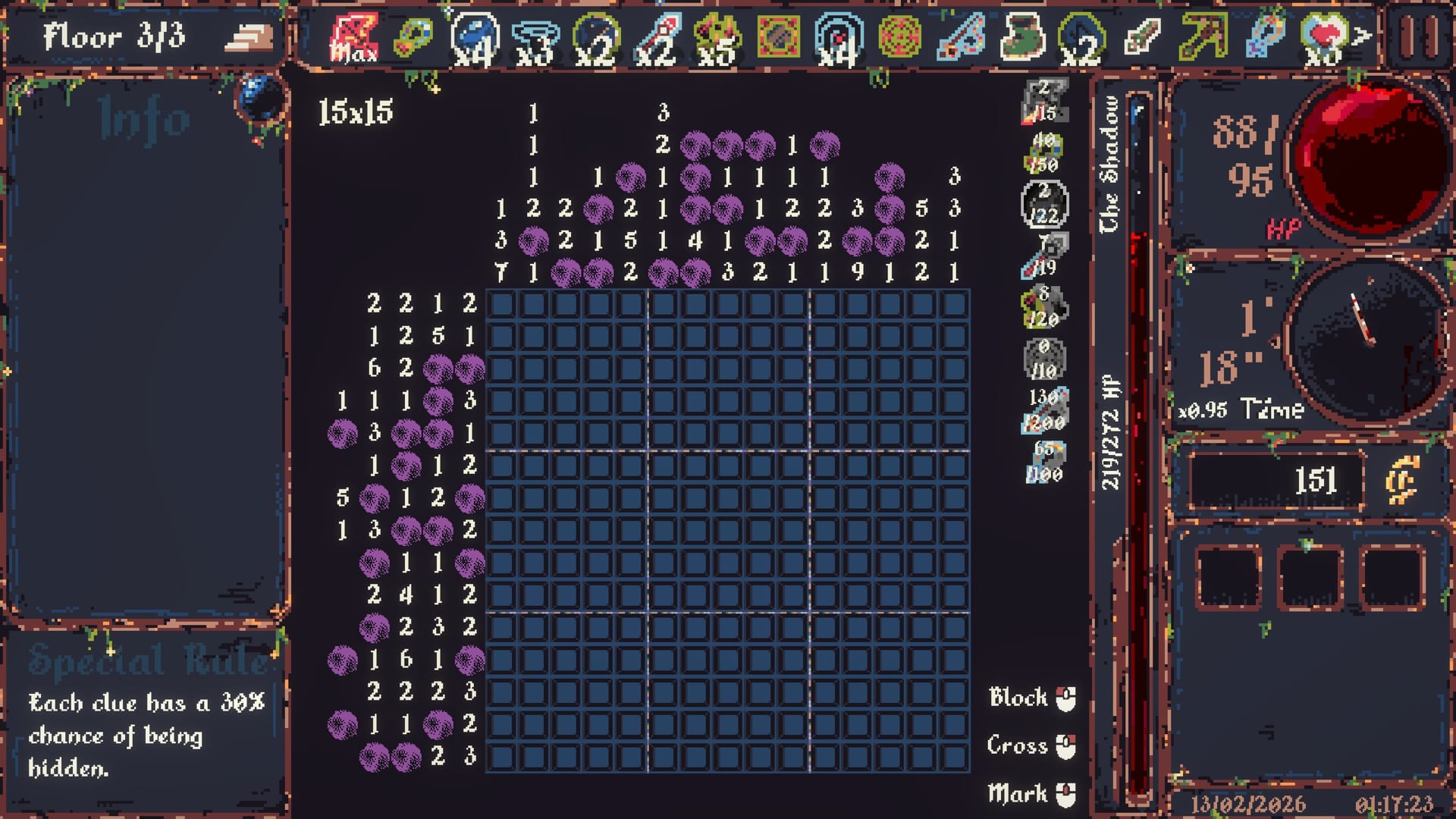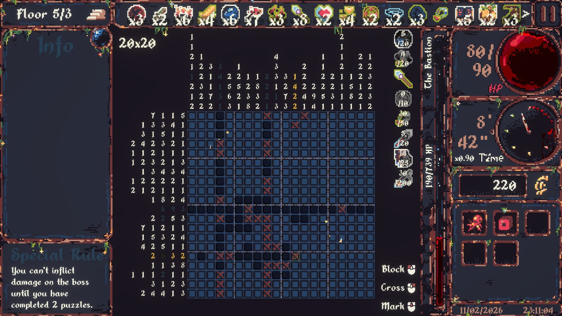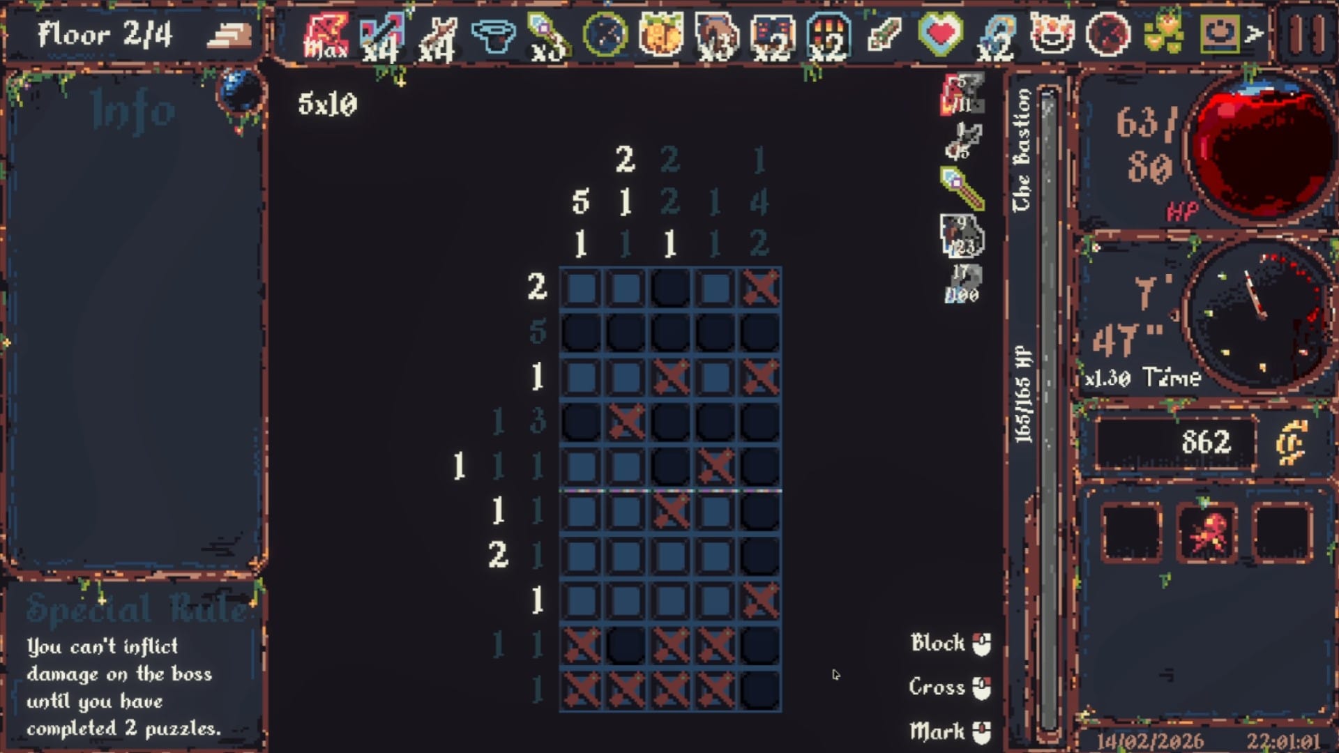 But so too does the rate with which your timer depletes. A pixelated dial – in a game of quite splendid pixel detail, right down to the hanging threads of moss and other such filth in this gloomy dungeon aesthetic. And while hitting zero on that timer doesn't necessarily spell the end, it's certainly a state best avoided if one truly wishes to have a lengthy run. More importantly, what makes CiniCross' eventual moment-to-moment play interesting, is through that almost-personal importance placed on solving a puzzle the "correct" way. Or rather: is taking one's time so as to not incur mistakes (every incorrect noting of a tile inuring a loss to one's HP) the more profitable means to survive, or is simply brute-forcing your way a more sufficient use of such scarce a resource that in-game minutes and seconds in this game, ends up being?