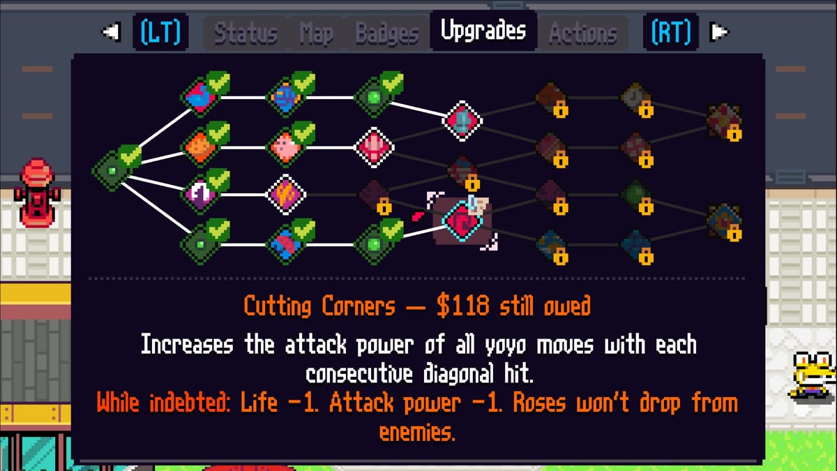 What this inevitably does for combat in Pipistrello and the Cursed Yo-Yo, is turn it into something that is equal parts exploitable and dangerous to one's own health pool. Even as one's arsenal of abilities increases – to the point where you're required to choose one over the other to assign to a particular input – the restraint on how aggressive you can be is kept relatively the same. Upgrading one's self doesn't mean you simply become invincible, it simply means you have more at your disposal to deal with what the game throws at you.